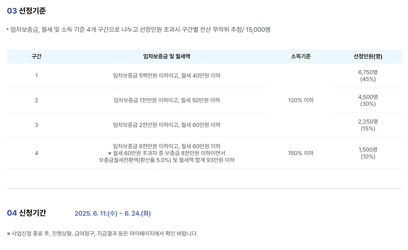 - 선정 방식: 임차보증금, 월세, 소득 기준으로 4개 구간 나누어 전산 무작위 추첨 (총 15,000명 선정, 저소득 구간 75% 배정)