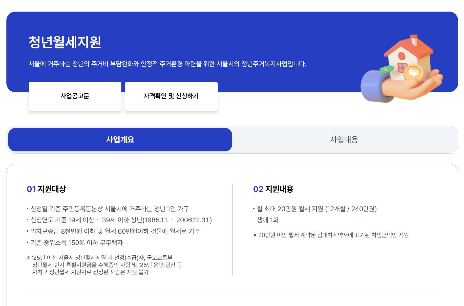 - 지원 금액: 월 최대 20만원 (임차보증금 및 관리비 제외, 실제 납부 월세 기준)